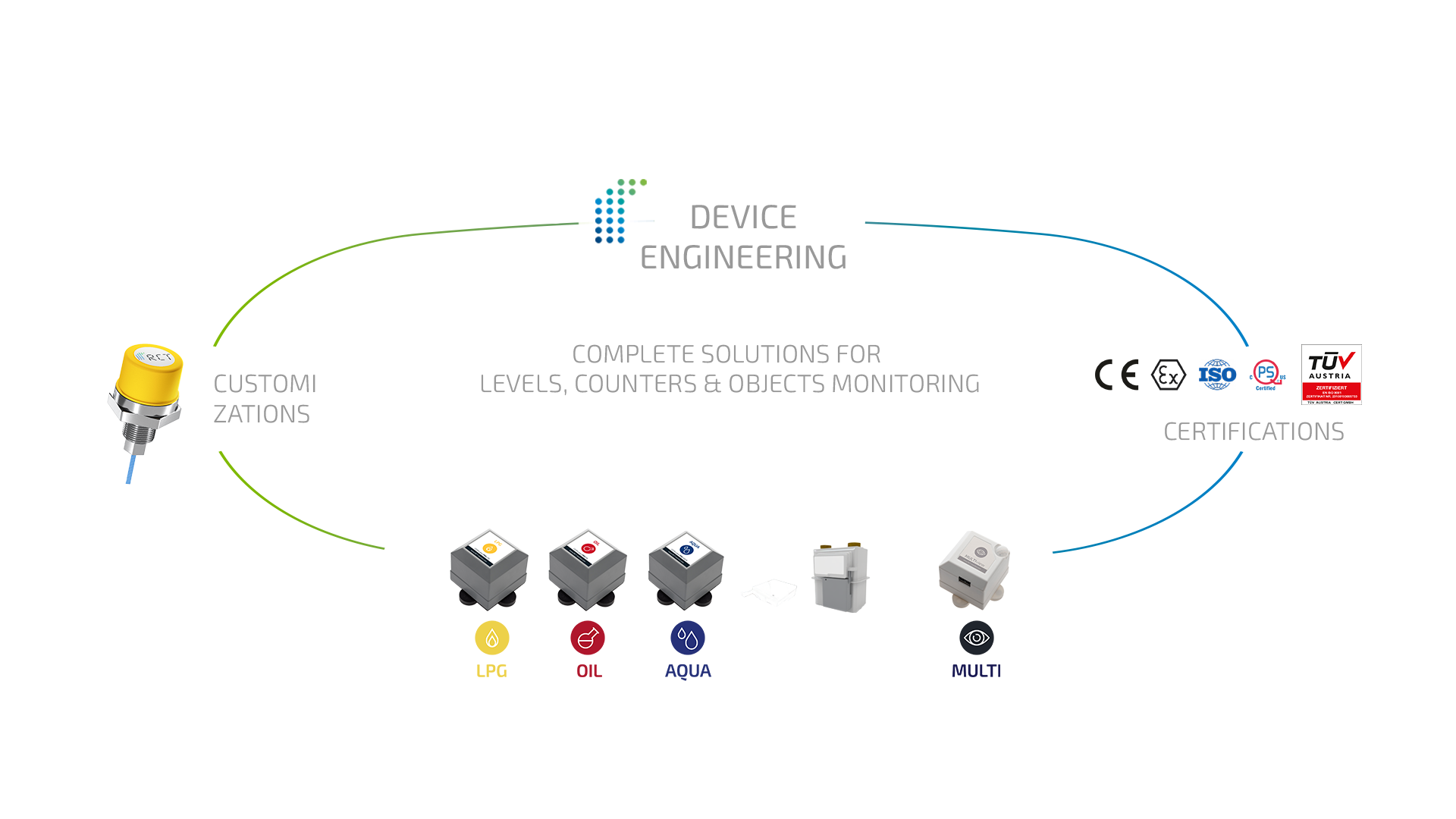 Level monitoring of liquid gas tanks (above/below ground, Ex 1) | local data transmission to RCT Radio Receivers e.g. LCD Display in living area, WLAN module and Data Logger | modular with different sensors and adapters | quick plug & play installation on existing systems.